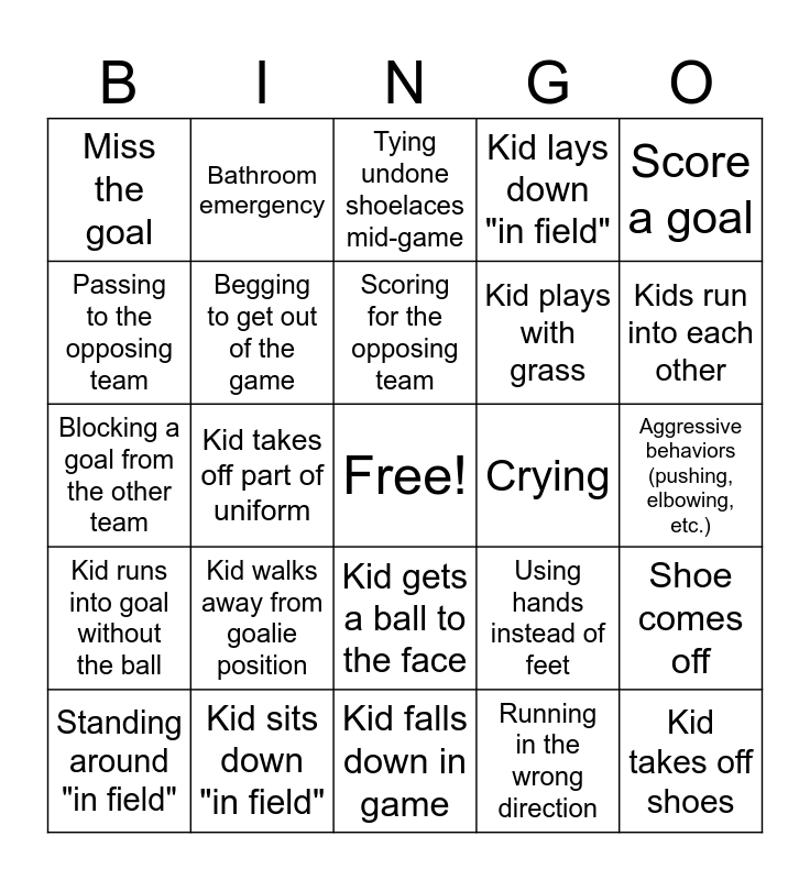 This bingo card has a free space and 24 words: Kid walks away from goalie position, Kid sits down "in field", Scoring for the opposing team, Standing around "in field", Score a goal, Miss the goal, Passing to the opposing team, Bathroom emergency, Crying, Kid gets a ball to the face, Kid plays with grass, Blocking a goal from the other team, Using hands instead of feet, Shoe comes off, Begging to get out of the game, Running in the wrong direction, Aggressive behaviors (pushing, elbowing, etc.), Tying undone shoelaces mid-game, Kids run into each other, Kid takes off part of uniform, Kid takes off shoes, Kid runs into goal without the ball, Kid lays down "in field" and Kid falls down in game.
