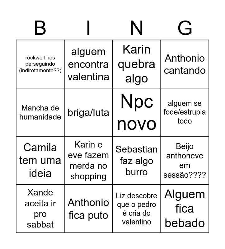 This bingo card has 16 words: Anthonio fica puto, Beijo anthoneve em sessão????, Karin quebra algo, rockwell nos perseguindo (indiretamente??), Camila tem uma ideia, alguem encontra valentina, Sebastian faz algo burro, Liz descobre que o pedro é cria do valentino, Mancha de humanidade, briga/luta, Xande aceita ir pro sabbat, Anthonio cantando, Karin e eve fazem merda no shopping, alguem se fode/estrupia todo, Npc novo and Alguem fica bebado.