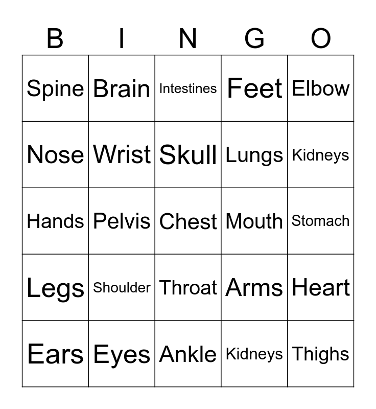 This bingo card has a free space and 24 words: Shoulder, Eyes, Skull, Ears, Elbow, Spine, Nose, Brain, Mouth, Throat, Lungs, Hands, Arms, Heart, Wrist, Kidneys, Stomach, Intestines, Kidneys, Pelvis, Thighs, Legs, Feet and Ankle.