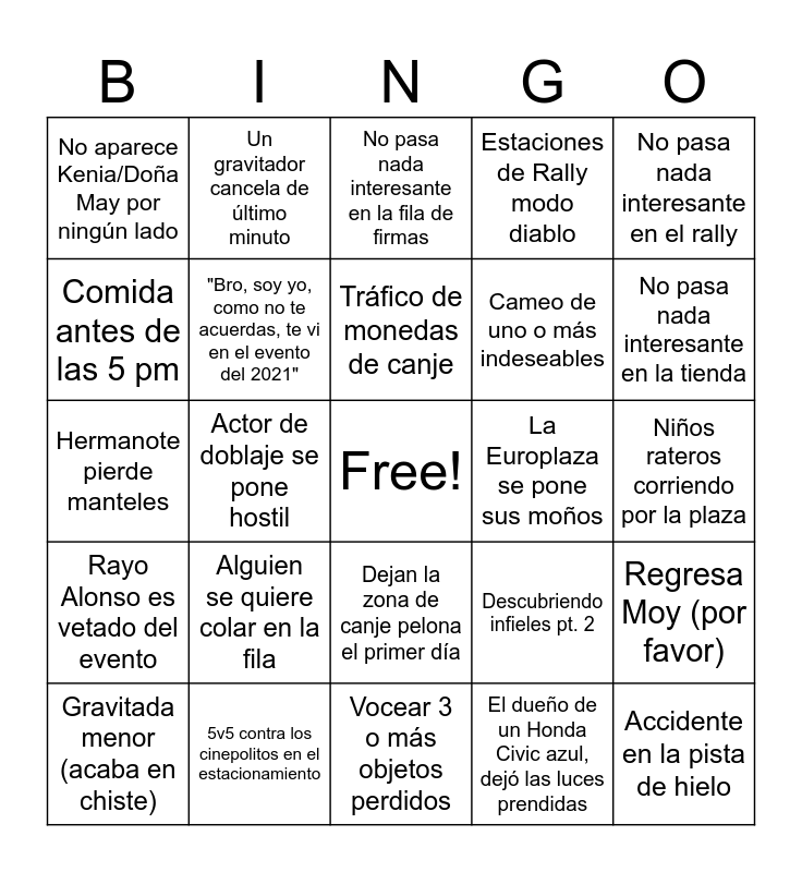 This bingo card has a free space and 29 words: Gravitada menor (acaba en chiste), Madera no chambea, Actor de doblaje se pone hostil, Se pierde algo importante en la hora pico, No aparece Kenia/Doña May por ningún lado, No pasa nada interesante en la fila de firmas, "Bro, soy yo, como no te acuerdas, te vi en el evento del 2021", Alguien se quiere colar en la fila, La Europlaza se pone sus moños, 5v5 contra los cinepolitos en el estacionamiento, Niños rateros corriendo por la plaza, Accidente en la pista de hielo, Vocear 3 o más objetos perdidos, El dueño de un Honda Civic azul, dejó las luces prendidas, No pasa nada interesante en la tienda, La tienda hace más en corte que el stand, Dejan la zona de canje pelona el primer día, Rayo Alonso es vetado del evento, No pasa nada interesante en el rally, Hermanote pierde manteles, Descubriendo infieles pt. 2, Reyner se pone amarillo antes de las 6 pm, Cameo de uno o más indeseables, Comida antes de las 5 pm, Estaciones de Rally modo diablo, Un gravitador cancela de último minuto, Regresa Moy (por favor), Tráfico de monedas de canje and Gravitada mayor (acaba en funa).
