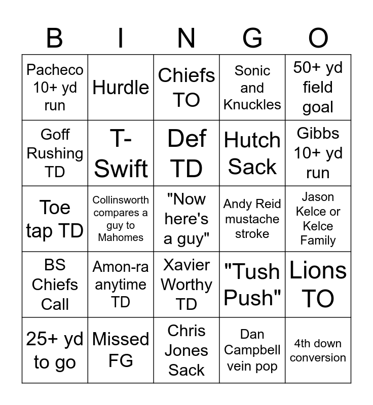 This bingo card has a free space and 24 words: Amon-ra anytime TD, Missed FG, Def TD, 25+ yd to go, 50+ yd field goal, Pacheco 10+ yd run, Goff Rushing TD, Hurdle, Andy Reid mustache stroke, Xavier Worthy TD, Hutch Sack, Toe tap TD, "Tush Push", Lions TO, T-Swift, Dan Campbell vein pop, Jason Kelce or Kelce Family, Chiefs TO, Gibbs 10+ yd run, Collinsworth compares a guy to Mahomes, 4th down conversion, BS Chiefs Call, Sonic and Knuckles and Chris Jones Sack.