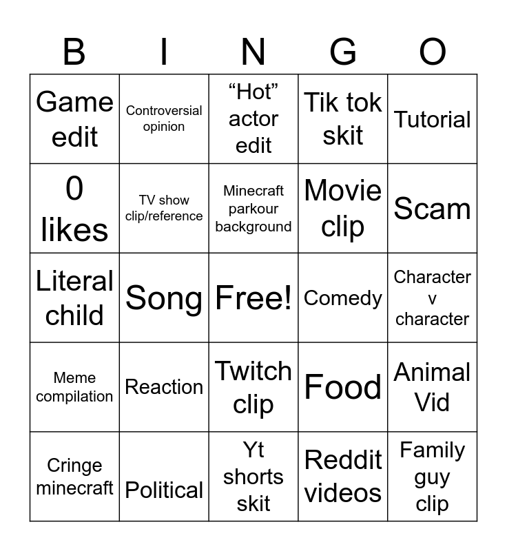 This bingo card has a free space and 24 words: Reaction, Political, Minecraft parkour background, Cringe minecraft, Tutorial, Game edit, 0 likes, Controversial opinion, Comedy, Twitch clip, Movie clip, Literal child, Food, Animal Vid, TV show clip/reference, Reddit videos, Character v character, “Hot” actor edit, Scam, Song, Family guy clip, Meme compilation, Tik tok skit and Yt shorts skit.