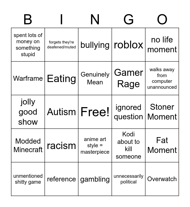 This bingo card has a free space and 44 words: Pokemon, Overwatch, Game specific language that would confuse normal people, unmentioned shitty game, shitty show, unnecessarily political, bullying, diddy moment, no life moment, reference, roblox, ignored question, anime art style = masterpiece, racism, describing what's happening in the game and nothing else, gambling, unmentioned good game, jolly good show, slur, walks away from computer unannounced, forgets they're deafened/muted, Mind Numbing Stupidity, laughing at something unfunny, spent lots of money on something stupid, Sandy Dying, Stoner Moment, Everyone Is Streaming, Borderlands, Kodi about to kill someone, Modded Minecraft, Vocal Stim, Fat Moment, Lowkey Gay, College Moment, Autism, Brainrot, Complaining about some asshole we know, Highkey Gay, Genuinely Mean, Warframe, Gamer Rage, Niche Reference, Eating and Interrupted.