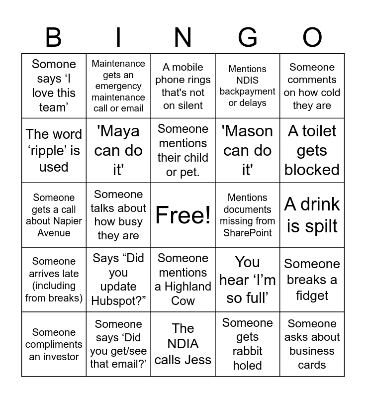 This bingo card has a free space and 44 words: Dan and Jess disagree, Someone asks about business cards, We go overtime on an agenda item, Someone compliments an investor, Someone wears or uses Everhomes merch, Someone gets rabbit holed, A mobile phone rings that's not on silent, You see someone draw or doodle in their notepad, Someone comments on how cold they are, Someone says ‘Did you get/see that email?’, Mentions NDIS backpayment or delays, Mentions documents missing from SharePoint, Someone mentions a Highland Cow, Says “Did you update Hubspot?”, Something gets car parked, The NDIA calls Jess, Someone refers to Appendix H, Someone gets a call about Napier Avenue, Someone gets a call about the Rocky Apartments., A toilet gets blocked, Maintenance gets an emergency maintenance call or email, Reference made to ‘the pipeline’, Someone says ‘Continuous Improvement’, Somone says ‘I love this team’, Someone takes off their shoes, A drink is spilt, Uses the word ‘we need a process’, Someone says ‘That can be automated’, You hear ‘I’m so full’, Someone arrives late (including from breaks), Sigma collapse if brought up., Someone breaks a fidget, Dialpad is mentioned., Matt is mentioned, Someone talks about how busy they are, Someone has or mentions IT issues., References to a spreadsheet., Someone promotes ‘Golden Light’, Someone mentions their child or pet., The word ‘ripple’ is used, 'Mason can do it', 'Does Claire know how to do *** yet?', 'Maya can do it' and 'Keighley can do it'.