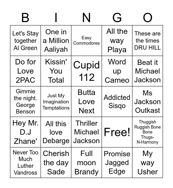 This bingo card has 25 words: All this love Debarge, Full moon Brandy, Cupid 112, Never Too Much Luther Vandross, These are the times DRU HILL, Let's Stay together Al Green, Do for Love 2PAC, One in a Million Aaliyah, Addicted Sisqo, Thriller Michael Jackson, Word up Cameo, Gimmie the night. George Benson, Free!, Thuggish Ruggish Bone Bone Thugs- N-Harmony, Kissin' You Total, My way Usher, Ms Jackson Outkast, Easy Commodores, Beat it Michael Jackson, Just My Imagination Temptations, Butta Love Next, Cherish the day Sade, Hey Mr. D.J Zhane', All the way Playa and Promise Jagged Edge.