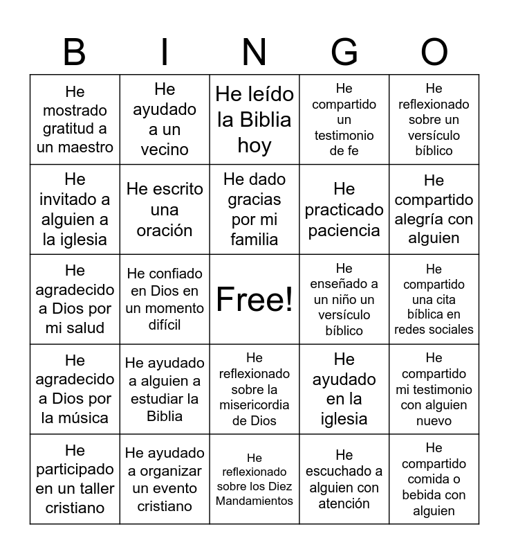 This bingo card has a free space and 77 words: He compartido el Evangelio con alguien esta semana, He orado por un amigo o familiar, He leído la Biblia hoy, He asistido a la iglesia esta semana, He ayudado a alguien sin esperar nada a cambio, He perdonado a alguien recientemente, He agradecido a Dios por algo hoy, He compartido un versículo bíblico con alguien, He cantado una canción de alabanza, He hablado con alguien sobre la oración, He participado en un grupo de estudio bíblico, He animado a alguien que estaba triste, He dado gracias por mi familia, He invitado a alguien a la iglesia, He recordado a alguien con un gesto amable, He confiado en Dios en un momento difícil, He ayudado a alguien con sus tareas o responsabilidades, He compartido comida o bebida con alguien, He orado en voz alta por otros, He reflexionado sobre un versículo bíblico, He llamado a un amigo para animarlo, He agradecido a Dios por mi salud, He escrito una oración, He ayudado a un vecino, He compartido un testimonio de fe, He participado en un servicio comunitario, He cantado en un grupo de adoración, He aprendido un versículo nuevo, He mostrado respeto a mis mayores, He dado gracias a Dios por mis amigos, He invitado a alguien a un evento cristiano, He ayudado a alguien a resolver un problema, He reflexionado sobre la creación de Dios, He ayudado en la iglesia, He compartido alegría con alguien, He practicado paciencia, He orado por un líder o maestro, He participado en un proyecto de caridad, He compartido una cita bíblica en redes sociales, He escuchado a alguien con atención, He agradecido por mi hogar, He visitado a alguien enfermo, He dado un consejo basado en la Biblia, He ayudado a alguien a orar, He aprendido sobre un personaje bíblico, He practicado la humildad, He participado en un taller cristiano, He mostrado gratitud a un maestro, He dado tiempo a alguien que necesitaba ayuda, He leído un capítulo de la Biblia, He compartido un acto de bondad con un extraño, He reflexionado sobre la misericordia de Dios, He ayudado a limpiar un lugar público, He invitado a un amigo a rezar, He enseñado algo bueno a alguien, He orado por mi comunidad, He cantado alabanzas en familia, He agradecido a Dios por un logro, He compartido una historia bíblica, He cuidado la naturaleza, He ayudado a alguien a estudiar la Biblia, He reflexionado sobre mis errores, He animado a alguien a seguir a Dios, He compartido un mensaje de esperanza, He agradecido por el alimento, He participado en una oración grupal, He escuchado un sermón atentamente, He enseñado a un niño un versículo bíblico, He hecho un acto secreto de bondad, He aprendido sobre la vida de Jesús, He orado por mi país, He compartido mi testimonio con alguien nuevo, He agradecido a Dios por la música, He ayudado a organizar un evento cristiano, He demostrado respeto a alguien con autoridad, He reflexionado sobre los Diez Mandamientos and He dado palabras de aliento a alguien.