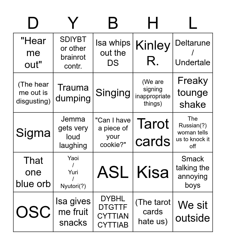 This bingo card has 25 words: Yaoi / Yuri / Nyutori(?), DYBHL DTGTTF CYTTIAN CYTTIAB, Singing, OSC, Deltarune / Undertale, "Hear me out", (The hear me out is disgusting), SDIYBT or other brainrot contr., Tarot cards, ASL, (We are signing inappropriate things), Sigma, Kisa, Smack talking the annoying boys, Trauma dumping, We sit outside, The Russian(?) woman tells us to knock it off, Isa whips out the DS, Freaky tounge shake, Jemma gets very loud laughing, "Can I have a piece of your cookie?", Isa gives me fruit snacks, That one blue orb, Kinley R. and (The tarot cards hate us).