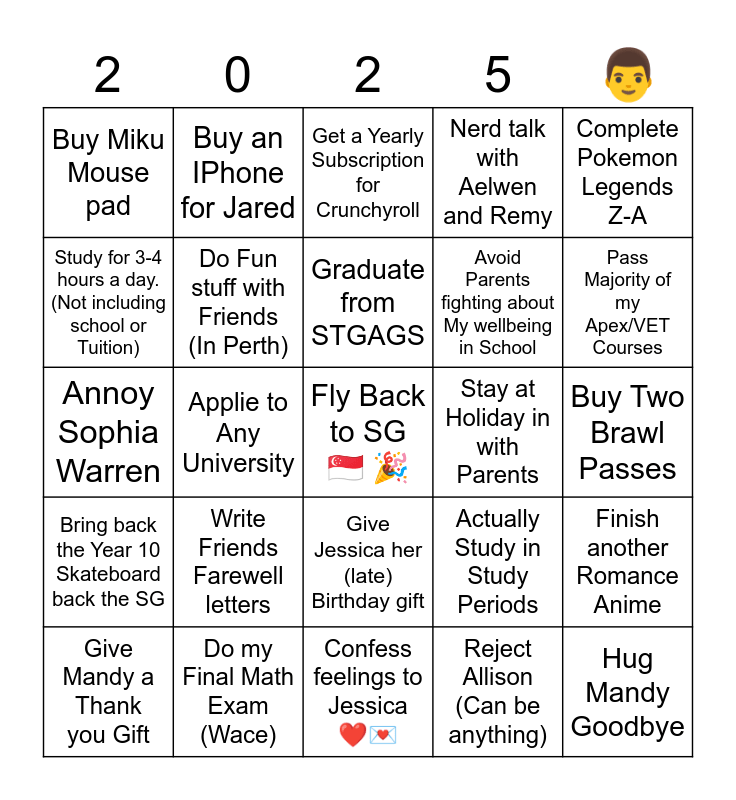 This bingo card has a free space and 24 words: Write Friends Farewell letters, Do my Final Math Exam (Wace), Graduate from STGAGS, Give Mandy a Thank you Gift, Complete Pokemon Legends Z-A, Buy Miku Mouse pad, Study for 3-4 hours a day. (Not including school or Tuition), Buy an IPhone for Jared, Stay at Holiday in with Parents, Give Jessica her (late) Birthday gift, Avoid Parents fighting about My wellbeing in School, Annoy Sophia Warren, Actually Study in Study Periods, Finish another Romance Anime, Do Fun stuff with Friends (In Perth), Reject Allison (Can be anything), Buy Two Brawl Passes, Get a Yearly Subscription for Crunchyroll, Pass Majority of my Apex/VET Courses, Applie to Any University, Hug Mandy Goodbye, Bring back the Year 10 Skateboard back the SG, Nerd talk with Aelwen and Remy and Confess feelings to Jessica ❤️💌.