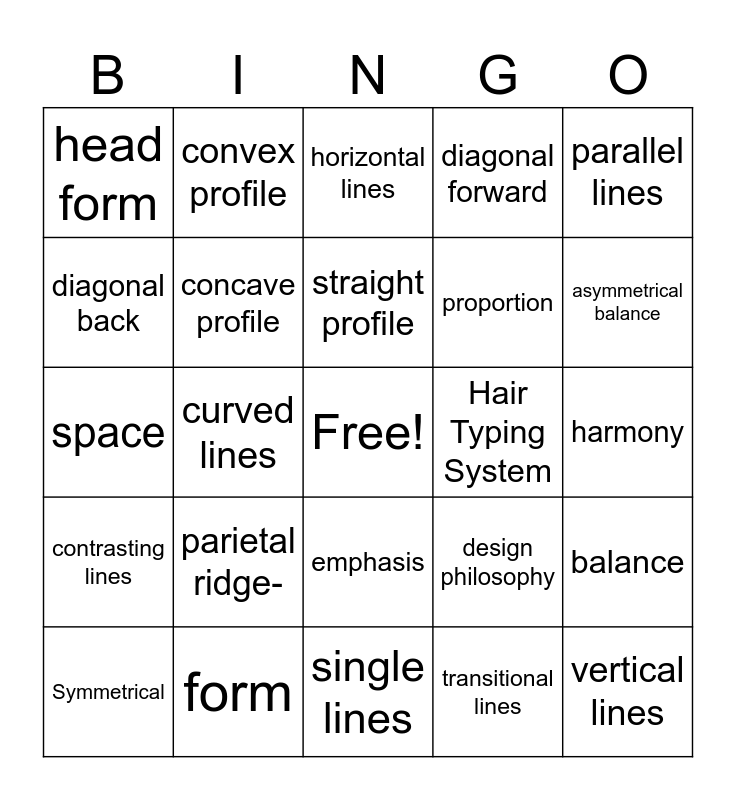 This bingo card has a free space and 24 words: Symmetrical, parietal ridge-, straight profile, transitional lines, parallel lines, head form, convex profile, horizontal lines, Hair Typing System, harmony, space, concave profile, design philosophy, balance, diagonal back, form, single lines, diagonal forward, asymmetrical balance, contrasting lines, curved lines, emphasis, proportion and vertical lines.