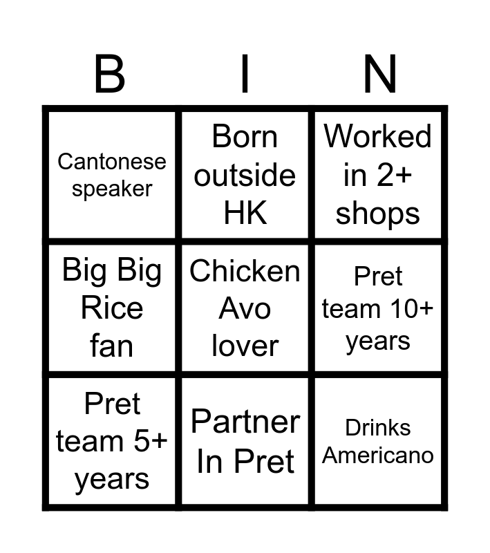 This bingo card has 9 words: Pret team 5+ years, Worked in 2+ shops, Born outside HK, Big Big Rice fan, Cantonese speaker, Pret team 10+ years, Chicken Avo lover, Drinks Americano and Partner In Pret.