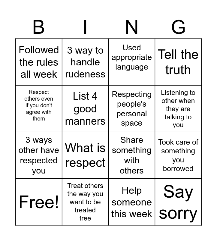 This bingo card has 16 words: Treat others the way you want to be treated free, Took care of something you borrowed, Used appropriate language, Followed the rules all week, 3 ways other have respected you, 3 way to handle rudeness, Share something with others, Help someone this week, Respect others even if you don't agree with them, List 4 good manners, Free!, Tell the truth, What is respect, Listening to other when they are talking to you, Respecting people's personal space and Say sorry.