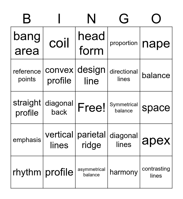 This bingo card has a free space and 24 words: vertical lines, profile, design line, rhythm, nape, bang area, reference points, coil, Symmetrical balance, parietal ridge, directional lines, straight profile, diagonal lines, apex, convex profile, harmony, space, head form, balance, diagonal back, contrasting lines, emphasis, proportion and asymmetrical balance.