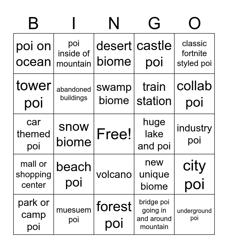 This bingo card has a free space and 24 words: beach poi, muesuem poi, swamp biome, park or camp poi, classic fortnite styled poi, poi on ocean, tower poi, poi inside of mountain, huge lake and poi, volcano, train station, car themed poi, new unique biome, city poi, abandoned buildings, bridge poi going in and around mountain, industry poi, desert biome, collab poi, snow biome, underground poi, mall or shopping center, castle poi and forest poi.