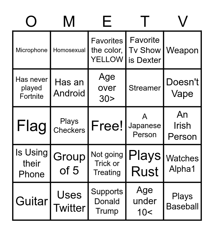 This bingo card has a free space and 24 words: Guitar, Group of 5, Age over 30>, Age under 10<, Weapon, Microphone, Homosexual, Favorites the color, YELLOW, A Japanese Person, An Irish Person, Flag, Has an Android, Plays Rust, Watches Alpha1, Has never played Fortnite, Uses Twitter, Supports Donald Trump, Favorite Tv Show is Dexter, Doesn't Vape, Is Using their Phone, Plays Checkers, Not going Trick or Treating, Streamer and Plays Baseball.