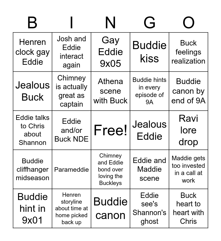 This bingo card has a free space and 24 words: Buddie hint in 9x01, Parameddie, Athena scene with Buck, Eddie see's Shannon's ghost, Buck feelings realization, Henren clock gay Eddie, Josh and Eddie interact again, Gay Eddie 9x05, Jealous Eddie, Ravi lore drop, Eddie talks to Chris about Shannon, Chimney is actually great as captain, Eddie and Maddie scene, Maddie gets too invested in a call at work, Jealous Buck, Henren storyline about time at home picked back up, Buddie canon, Buddie kiss, Buddie canon by end of 9A, Buddie cliffhanger midseason, Eddie and/or Buck NDE, Chimney and Eddie bond over loving the Buckleys, Buddie hints in every episode of 9A and Buck heart to heart with Chris.