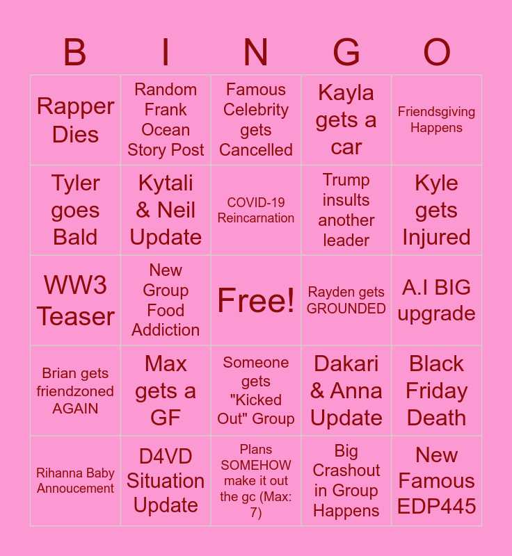 This bingo card has a free space and 24 words: Max gets a GF, D4VD Situation Update, COVID-19 Reincarnation, Rihanna Baby Annoucement, Friendsgiving Happens, Rapper Dies, Tyler goes Bald, Random Frank Ocean Story Post, Rayden gets GROUNDED, Someone gets "Kicked Out" Group, Trump insults another leader, WW3 Teaser, Dakari & Anna Update, Black Friday Death, Kytali & Neil Update, Big Crashout in Group Happens, A.I BIG upgrade, Famous Celebrity gets Cancelled, Kyle gets Injured, New Group Food Addiction, New Famous EDP445, Brian gets friendzoned AGAIN, Kayla gets a car and Plans SOMEHOW make it out the gc (Max: 7).