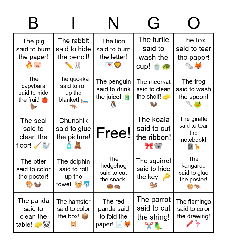 This bingo card has a free space and 33 words: The cat said to cut the paper! βοΈπ±, The dog said to fold the cardboard! π¦πΆ, Chunshik said to glue the picture! π§΄π§Έ, The capybara said to wash the bowl! π§Όπ¦«, The otter said to color the poster! π¨π¦¦, The quokka said to roll up the blanket! ποΈπ¦, The fox said to tear the paper! ποΈπ¦, The panda said to clean the table! π§½πΌ, The rabbit said to hide the pencil! βοΈπ°, The bear said to eat the cookie! πͺπ», The penguin said to drink the juice! π§π§, The lion said to burn the letter! ππ¦, The raccoon said to fold the napkin! π§»π¦, The owl said to glue the label! π·οΈπ¦, The koala said to cut the ribbon! ππ¨, The frog said to wash the spoon! π₯πΈ, The hamster said to color the box! π¦πΉ, The seal said to clean the floor! π§Ήπ¦, The dolphin said to roll up the towel! π§Ίπ¬, The squirrel said to hide the key! ππΏοΈ, The hedgehog said to eat the snack! π©π¦, The alpaca said to drink the milk! π₯π¦, The pig said to burn the paper! π₯π·, The giraffe said to tear the notebook! ππ¦, The red panda said to fold the paper! ππ¦, The flamingo said to color the drawing! ποΈπ¦©, The turtle said to wash the cup! π΅π’, The meerkat said to clean the shelf! π§½π¦¦, The capybara said to hide the fruit! ππ¦«, The kangaroo said to glue the poster! π¨π¦, The sheep said to roll up the mat! π§ββοΈπ, The parrot said to cut the string! βοΈπ¦ and The fox said to eat the sandwich! π₯ͺπ¦.