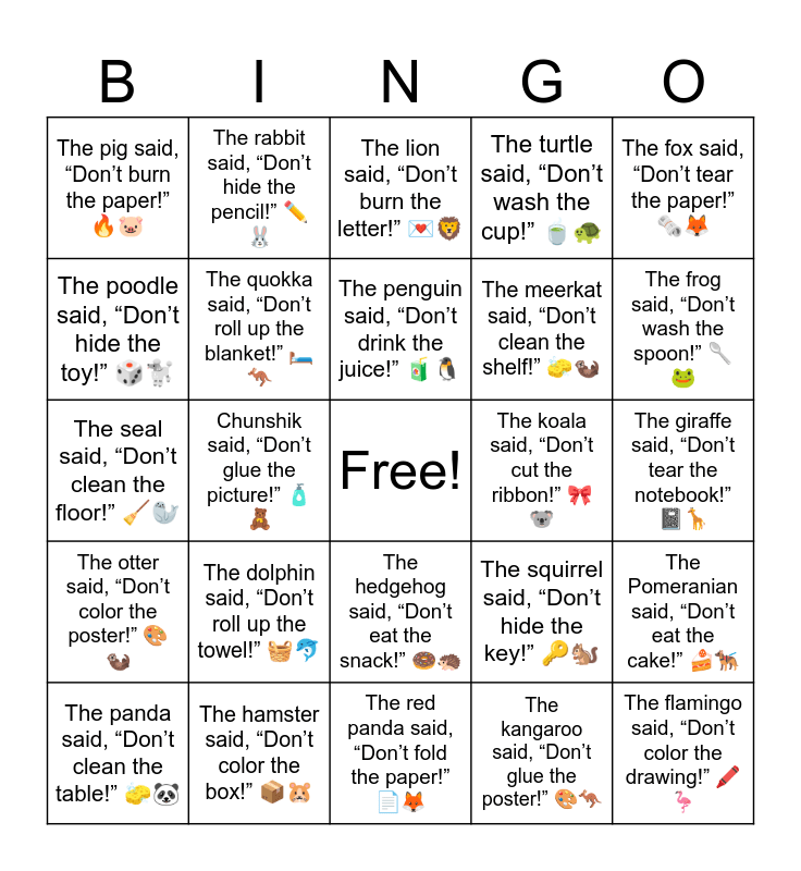 This bingo card has a free space and 33 words: The cat said, βDonβt cut the paper!β βοΈπ±, The dog said, βDonβt fold the cardboard!β π¦πΆ, Chunshik said, βDonβt glue the picture!β π§΄π§Έ, The capybara said, βDonβt wash the bowl!β π§Όπ¦«, The otter said, βDonβt color the poster!β π¨π¦¦, The quokka said, βDonβt roll up the blanket!β ποΈπ¦, The fox said, βDonβt tear the paper!β ποΈπ¦, The panda said, βDonβt clean the table!β π§½πΌ, The rabbit said, βDonβt hide the pencil!β βοΈπ°, The bear said, βDonβt eat the cookie!β πͺπ», The penguin said, βDonβt drink the juice!β π§π§, The lion said, βDonβt burn the letter!β ππ¦, The raccoon said, βDonβt fold the napkin!β π§»π¦, The owl said, βDonβt glue the label!β π·οΈπ¦, The koala said, βDonβt cut the ribbon!β ππ¨, The frog said, βDonβt wash the spoon!β π₯πΈ, The hamster said, βDonβt color the box!β π¦πΉ, The seal said, βDonβt clean the floor!β π§Ήπ¦, The dolphin said, βDonβt roll up the towel!β π§Ίπ¬, The squirrel said, βDonβt hide the key!β ππΏοΈ, The hedgehog said, βDonβt eat the snack!β π©π¦, The alpaca said, βDonβt drink the milk!β π₯π¦, The pig said, βDonβt burn the paper!β π₯π·, The giraffe said, βDonβt tear the notebook!β ππ¦, The red panda said, βDonβt fold the paper!β ππ¦, The flamingo said, βDonβt color the drawing!β ποΈπ¦©, The turtle said, βDonβt wash the cup!β π΅π’, The meerkat said, βDonβt clean the shelf!β π§½π¦¦, The poodle said, βDonβt hide the toy!β π²π©, The Pomeranian said, βDonβt eat the cake!β π°πβπ¦Ί, The capybara said, βDonβt roll up the map!β πΊοΈπ¦«, The kangaroo said, βDonβt glue the poster!β π¨π¦ and The sheep said, βDonβt cut the string!β βοΈπ.