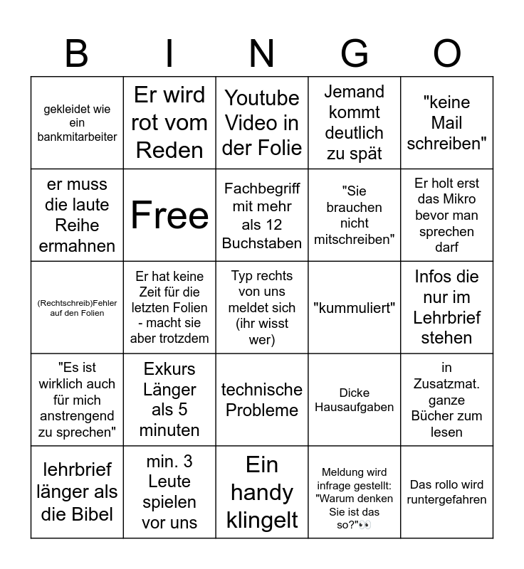 This bingo card has 25 words: Exkurs Länger als 5 minuten, Ein handy klingelt, Fachbegriff mit mehr als 12 Buchstaben, lehrbrief länger als die Bibel, "keine Mail schreiben", gekleidet wie ein bankmitarbeiter, er muss die laute Reihe ermahnen, Er wird rot vom Reden, "kummuliert", technische Probleme, "Sie brauchen nicht mitschreiben", (Rechtschreib)Fehler auf den Folien, Dicke Hausaufgaben, in Zusatzmat. ganze Bücher zum lesen, Free, Das rollo wird runtergefahren, Infos die nur im Lehrbrief stehen, Youtube Video in der Folie, Er holt erst das Mikro bevor man sprechen darf, Er hat keine Zeit für die letzten Folien - macht sie aber trotzdem, Typ rechts von uns meldet sich (ihr wisst wer), min. 3 Leute spielen vor uns, "Es ist wirklich auch für mich anstrengend zu sprechen", Jemand kommt deutlich zu spät and Meldung wird infrage gestellt: "Warum denken Sie ist das so?"👀.