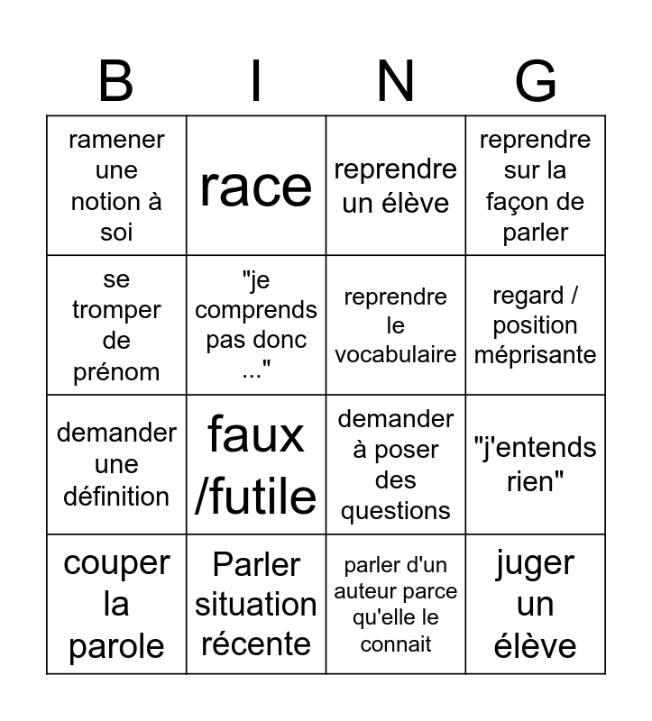 This bingo card has 16 words: Parler situation récente, "j'entends rien", reprendre un élève, ramener une notion à soi, demander une définition, race, demander à poser des questions, parler d'un auteur parce qu'elle le connait, se tromper de prénom, "je comprends pas donc ...", couper la parole, reprendre sur la façon de parler, faux /futile, regard / position méprisante, reprendre le vocabulaire and juger un élève.