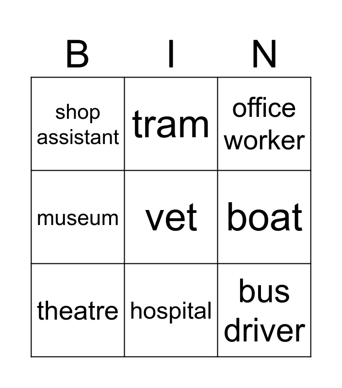 This bingo card has a free space and 8 words: boat, office worker, tram, theatre, shop assistant, bus driver, museum and hospital.