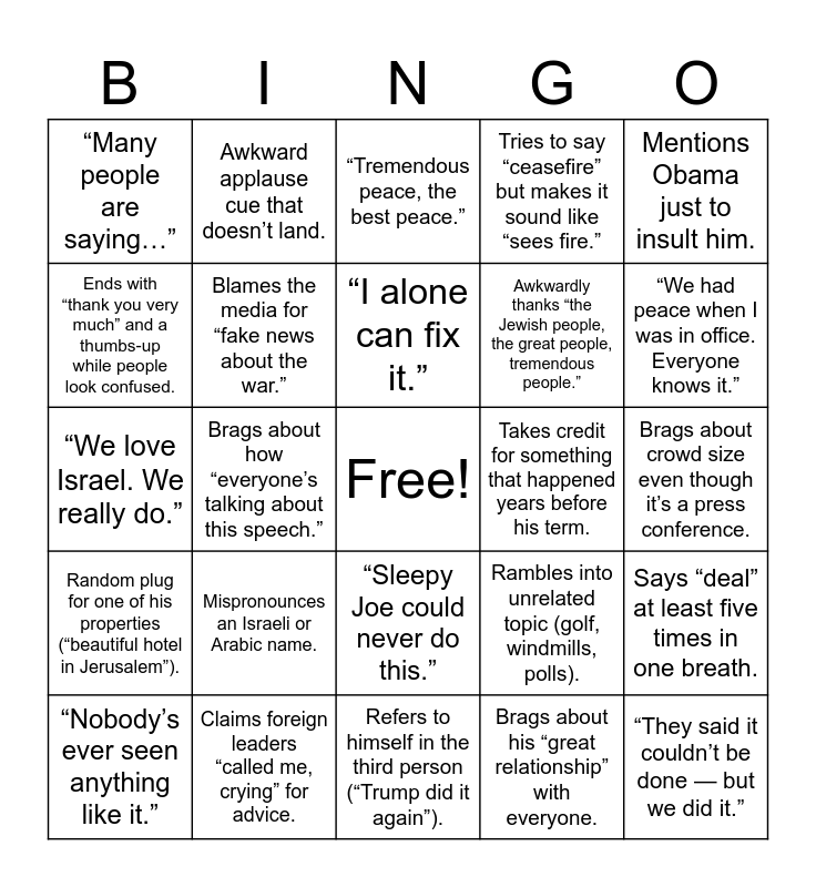 This bingo card has a free space and 24 words: “Nobody’s ever seen anything like it.”, Mispronounces an Israeli or Arabic name., “I alone can fix it.”, Brags about his “great relationship” with everyone., Mentions Obama just to insult him., “Many people are saying…”, Awkward applause cue that doesn’t land., “Tremendous peace, the best peace.”, Takes credit for something that happened years before his term., Brags about crowd size even though it’s a press conference., “We love Israel. We really do.”, Blames the media for “fake news about the war.”, Rambles into unrelated topic (golf, windmills, polls)., Says “deal” at least five times in one breath., Ends with “thank you very much” and a thumbs-up while people look confused., Claims foreign leaders “called me, crying” for advice., Refers to himself in the third person (“Trump did it again”)., Tries to say “ceasefire” but makes it sound like “sees fire.”, “We had peace when I was in office. Everyone knows it.”, Random plug for one of his properties (“beautiful hotel in Jerusalem”)., Brags about how “everyone’s talking about this speech.”, “Sleepy Joe could never do this.”, Awkwardly thanks “the Jewish people, the great people, tremendous people.” and “They said it couldn’t be done — but we did it.”.