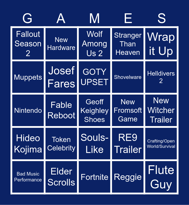 This bingo card has a free space and 24 words: Token Celebrity, Elder Scrolls, GOTY UPSET, Bad Music Performance, Wrap it Up, Fallout Season 2, Muppets, New Hardware, New Fromsoft Game, Souls-Like, Shovelware, Nintendo, RE9 Trailer, Crafting/Open World/Survival, Josef Fares, Reggie, New Witcher Trailer, Wolf Among Us 2, Helldivers 2, Fable Reboot, Flute Guy, Hideo Kojima, Stranger Than Heaven and Fortnite.