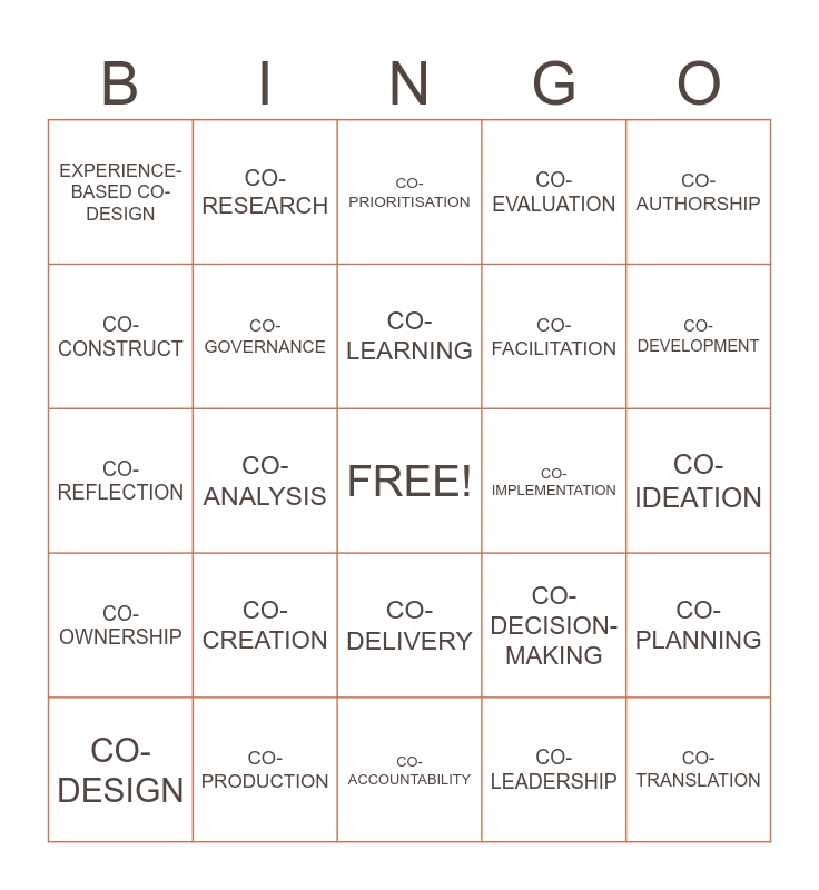 This bingo card has a free space and 24 words: CO-CREATION, CO-PRODUCTION, CO-LEARNING, CO-DESIGN, CO-AUTHORSHIP, EXPERIENCE-BASED CO-DESIGN, CO-CONSTRUCT, CO-RESEARCH, CO-IMPLEMENTATION, CO-DELIVERY, CO-FACILITATION, CO-REFLECTION, CO-DECISION-MAKING, CO-PLANNING, CO-GOVERNANCE, CO-LEADERSHIP, CO-IDEATION, CO-PRIORITISATION, CO-DEVELOPMENT, CO-ANALYSIS, CO-TRANSLATION, CO-OWNERSHIP, CO-EVALUATION and CO-ACCOUNTABILITY.