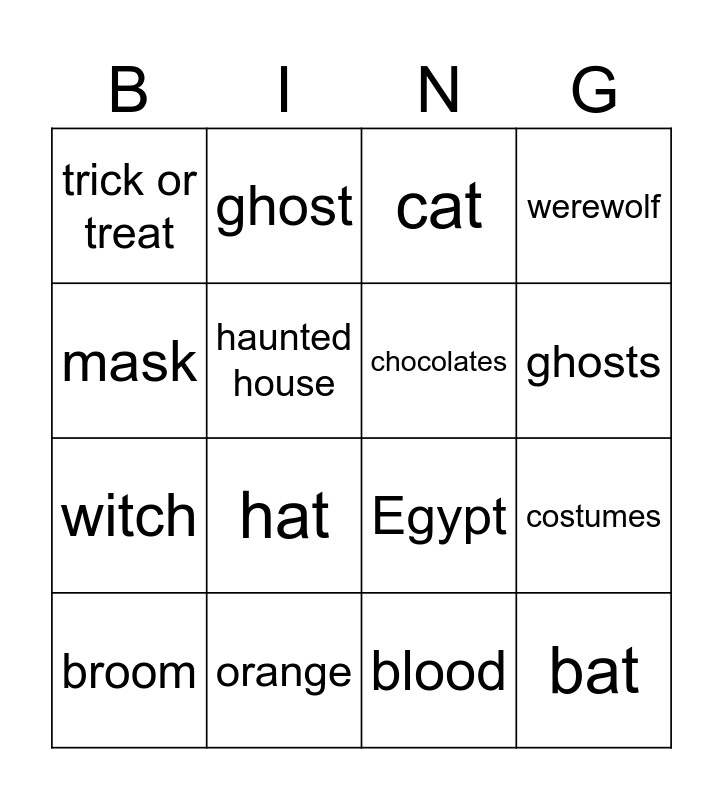 This bingo card has 16 words: orange, costumes, cat, trick or treat, witch, ghost, Egypt, blood, mask, haunted house, broom, werewolf, hat, ghosts, chocolates and bat.