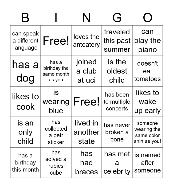 This bingo card has a free space and 25 words: has collected a petr sticker, has had braces, joined a club at uci, has a birthday this month, can play the piano, can speak a different language, has a dog, Free!, has been to multiple concerts, lived in another state, is the oldest child, likes to cook, has never broken a bone, someone wearing the same color shirt as you!, has a birthday the same month as you, plays a sport, likes to wake up early, loves the anteatery, doesn't eat tomatoes, is wearing blue, is named after someone, has solved a rubics cube, is an only child, traveled this past summer and has met a celebrity.
