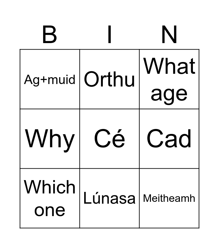 This bingo card has a free space and 8 words: Cad, What age, Orthu, Which one, Ag+muid, Meitheamh, Why and Lúnasa.