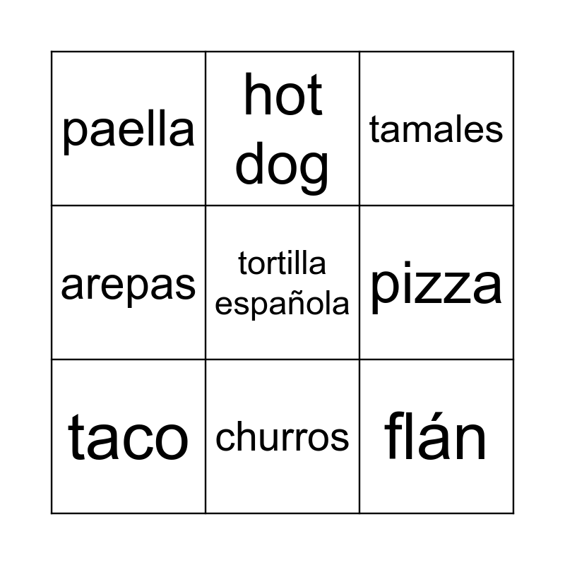 This bingo card has a free space and 8 words: pizza, tamales, hot dog, taco, paella, flán, arepas and churros.