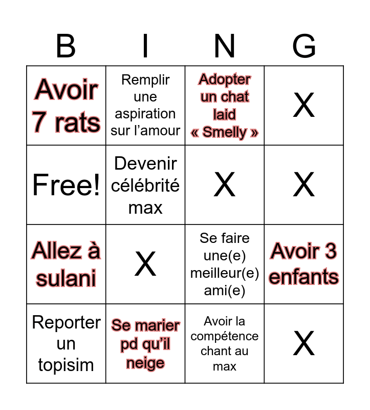 This bingo card has 16 words: Se marier pd qu’il neige, Avoir 3 enfants, Adopter un chat laid « Smelly », Avoir 7 rats, Allez à sulani, Remplir une aspiration sur l’amour, Se faire une(e) meilleur(e) ami(e), Avoir la compétence chant au max, Free!, Devenir célébrité max, Reporter un topisim, X, X, X, X and X.