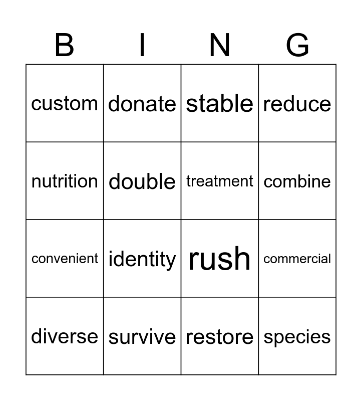 This bingo card has 38 words: approach, advise, recipe, treatment, illness, suggestion, combine, issue, nutrition, convenient, commercial, reduce, diverse, restore, double, species, estimate, stable, quantity, survive, custom, belief, identity, similarity, accomplishment, treat, raise, chance, local, festival, entertainment, sold-out, widely, donate, devoted, dominate, rush and interview.