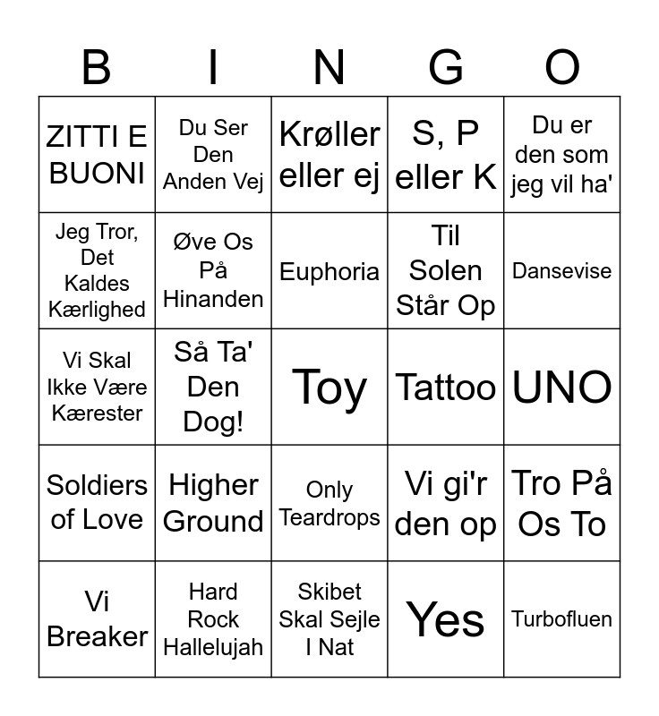 This bingo card has 63 words: Free!, Kickflipper, Arabiens Drøm, Tro På Os To, Du Du Du, Min Egen Maria, Du Ser Den Anden Vej, En For Alle, Alle For En, Euphoria, Fairytale, Only Teardrops, Rise Like a Phoenix, UNO, Du er den som jeg vil ha', SHUM, Jeg Tror, Det Kaldes Kærlighed, Så Ta' Den Dog!, ZITTI E BUONI, Cha Cha Cha, Til Solen Står Op, Higher Ground, Soldiers of Love, S, P eller K, Cliche Love Song, New Tomorrow, Det Er Bare Noget, Vi Leger, Der står et billede af dig på mit bord, Mig Og Min Amigo, Smuk som et stjerneskud, Under Stjernerne På Himlen, Vi Maler Byen Rød, Video video, Disco Tango, Jeg Bli'r Ved, Dansevise, Vi Breaker, Kun Min, Yes, Tro På Dig Selv, Øve Os På Hinanden, Vi Skal Ikke Være Kærester, Tattoo, Jeg Er En Gamer, Lyst Til At Hop', Toy, Hard Rock Hallelujah, Turbofluen, Vi gi'r den op, Pigen Er Min, Give That Wolf a Banana, Heroes, Skibet Skal Sejle I Nat, To Lys På Et Bord, Dansevise, Queen of Kings, Krøller eller ej, Hip Hurra - Det' Min Fødselsdag, Danse i Måneskin, Hallucination, Det Det, Mere Slik, Think About Things and Pinlig.