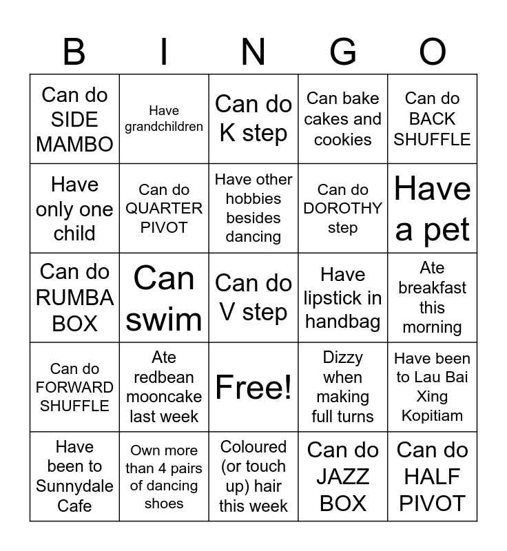 This bingo card has 26 words: Free!, Can do JAZZ BOX, Have other hobbies besides dancing, Own more than 4 pairs of dancing shoes, Can do BACK SHUFFLE, Can do SIDE MAMBO, Have only one child, Have grandchildren, Ate breakfast this morning, Dizzy when making full turns, Can do DOROTHY step, Can do RUMBA BOX, Have been to Lau Bai Xing Kopitiam, Have been to Sunnydale Cafe, Can swim, Have been to Europe, Can bake cakes and cookies, Can do FORWARD SHUFFLE, Can do K step, Can do V step, Have a pet, Coloured (or touch up) hair this week, Have lipstick in handbag, Ate redbean mooncake last week, Can do QUARTER PIVOT and Can do HALF PIVOT.