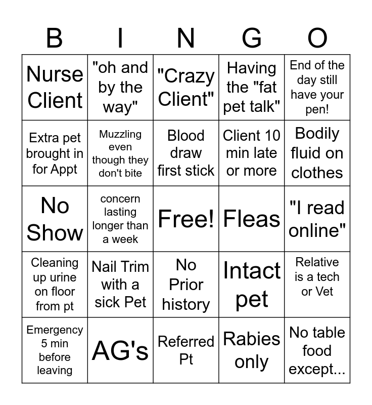 This bingo card has a free space and 24 words: Nail Trim with a sick Pet, AG's, Blood draw first stick, Emergency 5 min before leaving, End of the day still have your pen!, Nurse Client, Extra pet brought in for Appt, "oh and by the way", Fleas, No Prior history, Client 10 min late or more, No Show, Intact pet, Relative is a tech or Vet, Muzzling even though they don't bite, Rabies only, "I read online", "Crazy Client", Bodily fluid on clothes, concern lasting longer than a week, No table food except..., Cleaning up urine on floor from pt, Having the "fat pet talk" and Referred Pt.