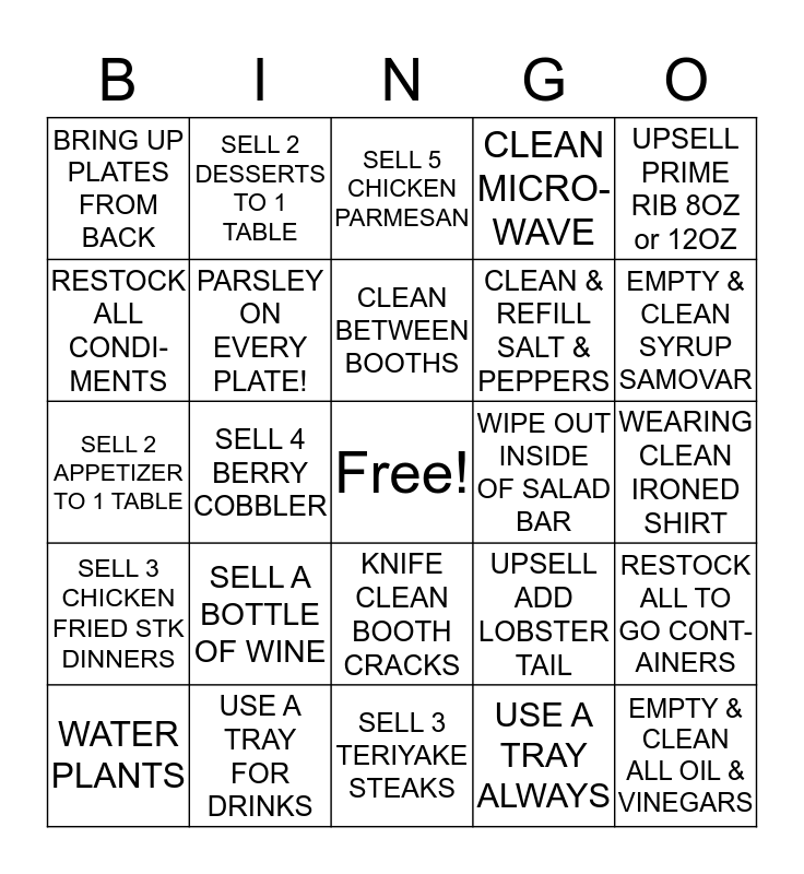 This bingo card has a free space and 24 words: SELL A BOTTLE OF WINE, USE A TRAY FOR DRINKS, CLEAN BETWEEN BOOTHS, WATER PLANTS, UPSELL PRIME RIB 8OZ or 12OZ, BRING UP PLATES FROM BACK, RESTOCK ALL CONDI- MENTS, SELL 2 DESSERTS TO 1 TABLE, WIPE OUT INSIDE OF SALAD BAR, KNIFE CLEAN BOOTH CRACKS, CLEAN & REFILL SALT & PEPPERS, SELL 2 APPETIZER TO 1 TABLE, UPSELL ADD LOBSTER TAIL, RESTOCK ALL TO GO CONT-AINERS, PARSLEY ON EVERY PLATE!, USE A TRAY ALWAYS, WEARING CLEAN IRONED SHIRT, SELL 5 CHICKEN PARMESAN, EMPTY & CLEAN SYRUP SAMOVAR, SELL 4 BERRY COBBLER, EMPTY & CLEAN ALL OIL & VINEGARS, SELL 3 CHICKEN FRIED STK DINNERS, CLEAN MICRO-WAVE and SELL 3 TERIYAKE STEAKS.