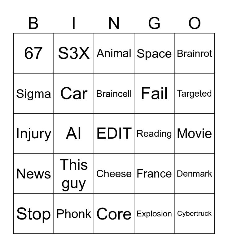 This bingo card has a free space and 24 words: This guy, Phonk, Braincell, Stop, Brainrot, 67, Sigma, S3X, Reading, Cheese, Fail, Injury, France, Denmark, Car, Explosion, Movie, Animal, Targeted, AI, Cybertruck, News, Space and Core.