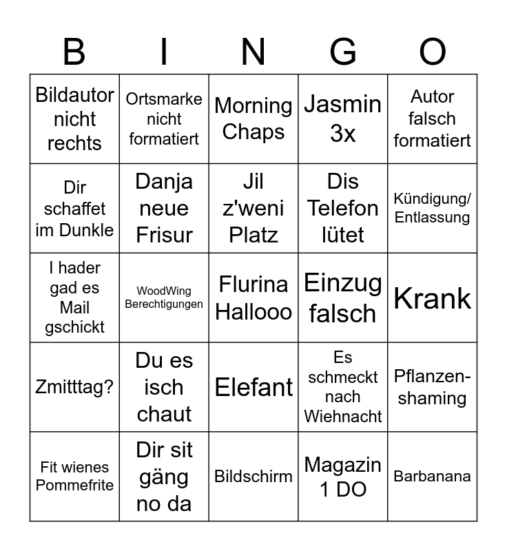 This bingo card has a free space and 24 words: Du es isch chaut, Dir sit gäng no da, Jil z'weni Platz, Fit wienes Pommefrite, Autor falsch formatiert, Bildautor nicht rechts, Dir schaffet im Dunkle, Ortsmarke nicht formatiert, Einzug falsch, Elefant, Dis Telefon lütet, I hader gad es Mail gschickt, Es schmeckt nach Wiehnacht, Pflanzen-shaming, Danja neue Frisur, Magazin 1 DO, Krank, Morning Chaps, Kündigung/ Entlassung, WoodWing Berechtigungen, Barbanana, Zmitttag?, Jasmin 3x and Bildschirm.