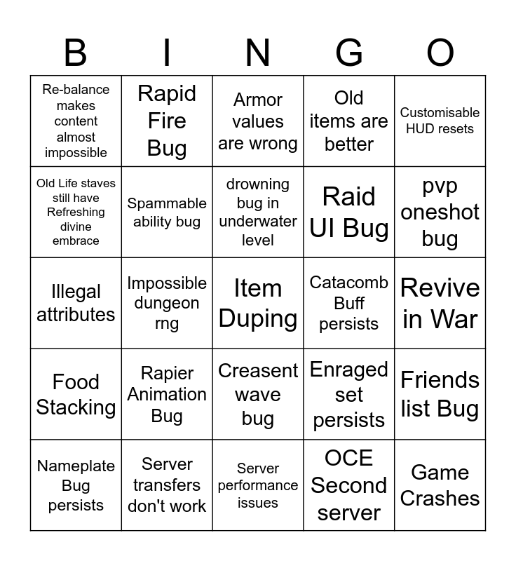 This bingo card has a free space and 24 words: Rapier Animation Bug, Server transfers don't work, drowning bug in underwater level, Nameplate Bug persists, Customisable HUD resets, Re-balance makes content almost impossible, Old Life staves still have Refreshing divine embrace, Rapid Fire Bug, Catacomb Buff persists, Creasent wave bug, Raid UI Bug, Illegal attributes, Enraged set persists, Friends list Bug, Spammable ability bug, OCE Second server, Revive in War, Armor values are wrong, pvp oneshot bug, Impossible dungeon rng, Game Crashes, Food Stacking, Old items are better and Server performance issues.