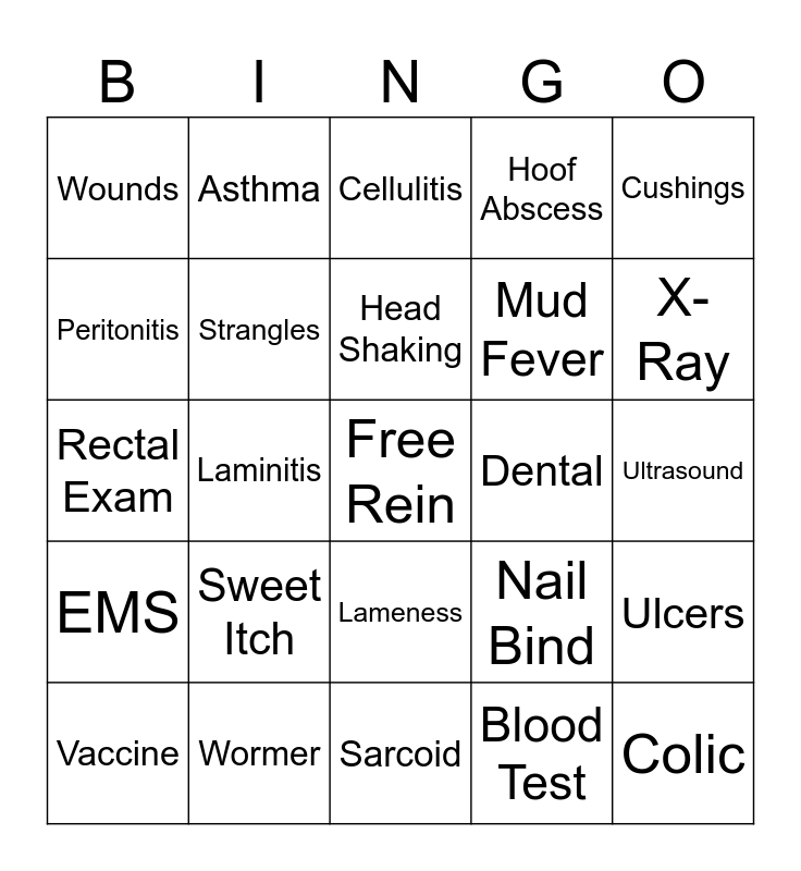 This bingo card has a free space and 24 words: Sweet Itch, Wormer, Head Shaking, Vaccine, Cushings, Wounds, Peritonitis, Asthma, Dental, Lameness, Mud Fever, Rectal Exam, Nail Bind, Ulcers, Strangles, Blood Test, Ultrasound, Cellulitis, X-Ray, Laminitis, Colic, EMS, Hoof Abscess and Sarcoid.