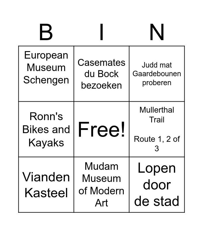 This bingo card has a free space and 8 words: Mullerthal Trail Route 1, 2 of 3, Judd mat Gaardebounen proberen, Casemates du Bock bezoeken, Vianden Kasteel, European Museum Schengen, Lopen door de stad, Ronn's Bikes and Kayaks and Mudam Museum of Modern Art.