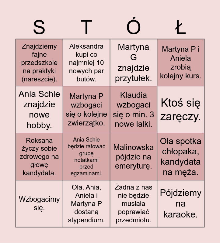 This bingo card has 16 words: Ola, Ania, Aniela i Martyna P dostaną stypendium., Ola spotka chłopaka, kandydata na męża., Martyna G znajdzie przytułek., Znajdziemy fajne przedszkole na praktyki (nareszcie)., Roksana życzy sobie zdrowego na głowę kandydata., Aleksandra kupi co najmniej 10 nowych par butów., Malinowska pójdzie na emeryturę., Żadna z nas nie będzie musiała poprawiać przedmiotu., Ania Schie znajdzie nowe hobby., Martyna P wzbogaci się o kolejne zwierzątko., Wzbogacimy się., Martyna P i Aniela zrobią kolejny kurs., Ania Schie będzie ratować grupę notatkami przed egzaminami., Ktoś się zaręczy., Klaudia wzbogaci się o min. 3 nowe lalki. and Pójdziemy na karaoke..