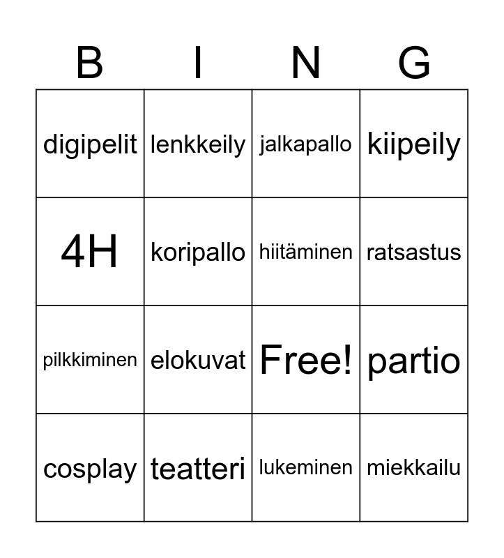 This bingo card has 19 words: Free!, jääkiekko, jalkapallo, miekkailu, partio, 4H, lukeminen, digipelit, lenkkeily, pilkkiminen, elokuvat, koripallo, hiitäminen, teatteri, cosplay, Pokemon Go, kiipeily, ratsastus and joku muu.