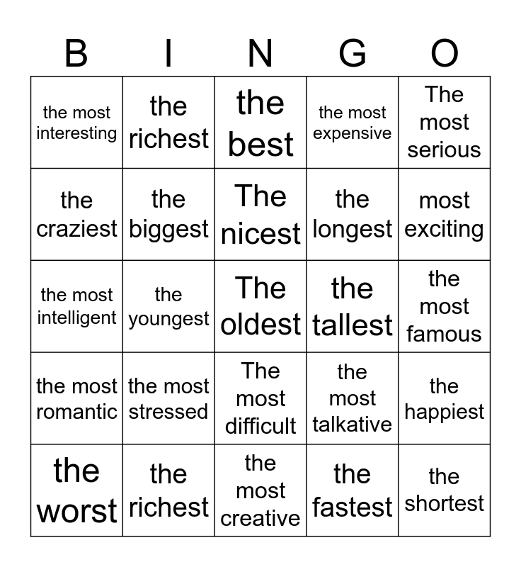 This bingo card has a free space and 27 words: the most talkative, the most dangerous, the longest, the most creative, the craziest, the best, the richest, the most romantic, the tallest, the happiest, the most intelligent, the most expensive, the worst, the richest, most exciting, the earliest, the biggest, The nicest, the most stressed, the most interesting, the most famous, the fastest, the youngest, the shortest, The most difficult, The most serious and The most responsible.