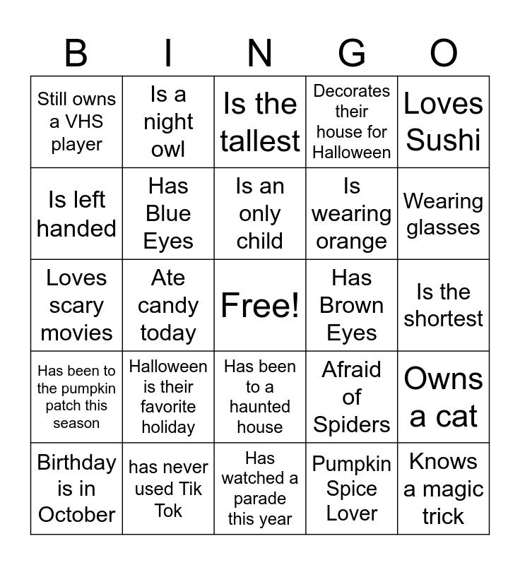 This bingo card has a free space and 24 words: Halloween is their favorite holiday, has never used Tik Tok, Is an only child, Birthday is in October, Loves Sushi, Still owns a VHS player, Is left handed, Is a night owl, Has Brown Eyes, Has been to a haunted house, Is wearing orange, Loves scary movies, Afraid of Spiders, Owns a cat, Has Blue Eyes, Pumpkin Spice Lover, Is the shortest, Is the tallest, Wearing glasses, Ate candy today, Knows a magic trick, Has been to the pumpkin patch this season, Decorates their house for Halloween and Has watched a parade this year.