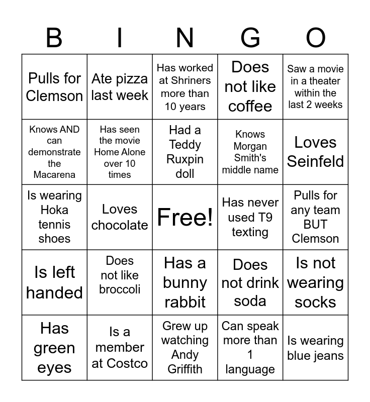 This bingo card has a free space and 24 words: Does not like broccoli, Is a member at Costco, Had a Teddy Ruxpin doll, Has green eyes, Saw a movie in a theater within the last 2 weeks, Pulls for Clemson, Knows AND can demonstrate the Macarena, Ate pizza last week, Has never used T9 texting, Has a bunny rabbit, Knows Morgan Smith's middle name, Is wearing Hoka tennis shoes, Does not drink soda, Is not wearing socks, Has seen the movie Home Alone over 10 times, Can speak more than 1 language, Pulls for any team BUT Clemson, Has worked at Shriners more than 10 years, Loves Seinfeld, Loves chocolate, Is wearing blue jeans, Is left handed, Does not like coffee and Grew up watching Andy Griffith.