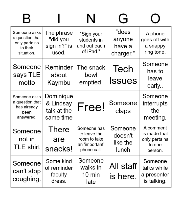 This bingo card has a free space and 24 words: There are snacks!, Some kind of reminder faculty dress., The snack bowl emptied., Someone can't stop coughing., A phone goes off with a snappy ring tone., Someone asks a question that only pertains to their situation., Someone says TLE motto, The phrase "did you sign in?" is used., Someone claps, Someone has to leave the room to take an 'important' phone call., Tech Issues, Someone asks a question that has already been answered., Someone doesn't like the lunch, A comment is made that only pertains to one person., Reminder about Kaymbu, All staff is here., Someone interrupts the meeting., "Sign your students in and out each of iPad.", Someone has to leave early.., Dominique & Lindsay talk at the same time, Someone talks while a presenter is talking., Someone not in TLE shirt, "does anyone have a charger." and Someone walks in 10 min late.
