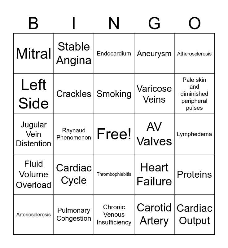 This bingo card has a free space and 29 words: Arteriosclerosis, Right Side, Raynaud Phenomenon, Pericarditis, Mitral, Endocardium, Crackles, Cardiac Cycle, AV Valves, Pulmonary Congestion, Lymphedema, Cardiac Output, Chronic Venous Insufficiency, Carotid Artery, Pale skin and diminished peripheral pulses, Intermittent Claudication, Thrombophlebitis, Fluid Volume Overload, Atherosclerosis, Jugular Vein Distention, Heart Failure, Activity Intolerance, Varicose Veins, Left Side, Aneurysm, Stable Angina, Proteins, Smoking and Left Ventricular Hypertrophy.